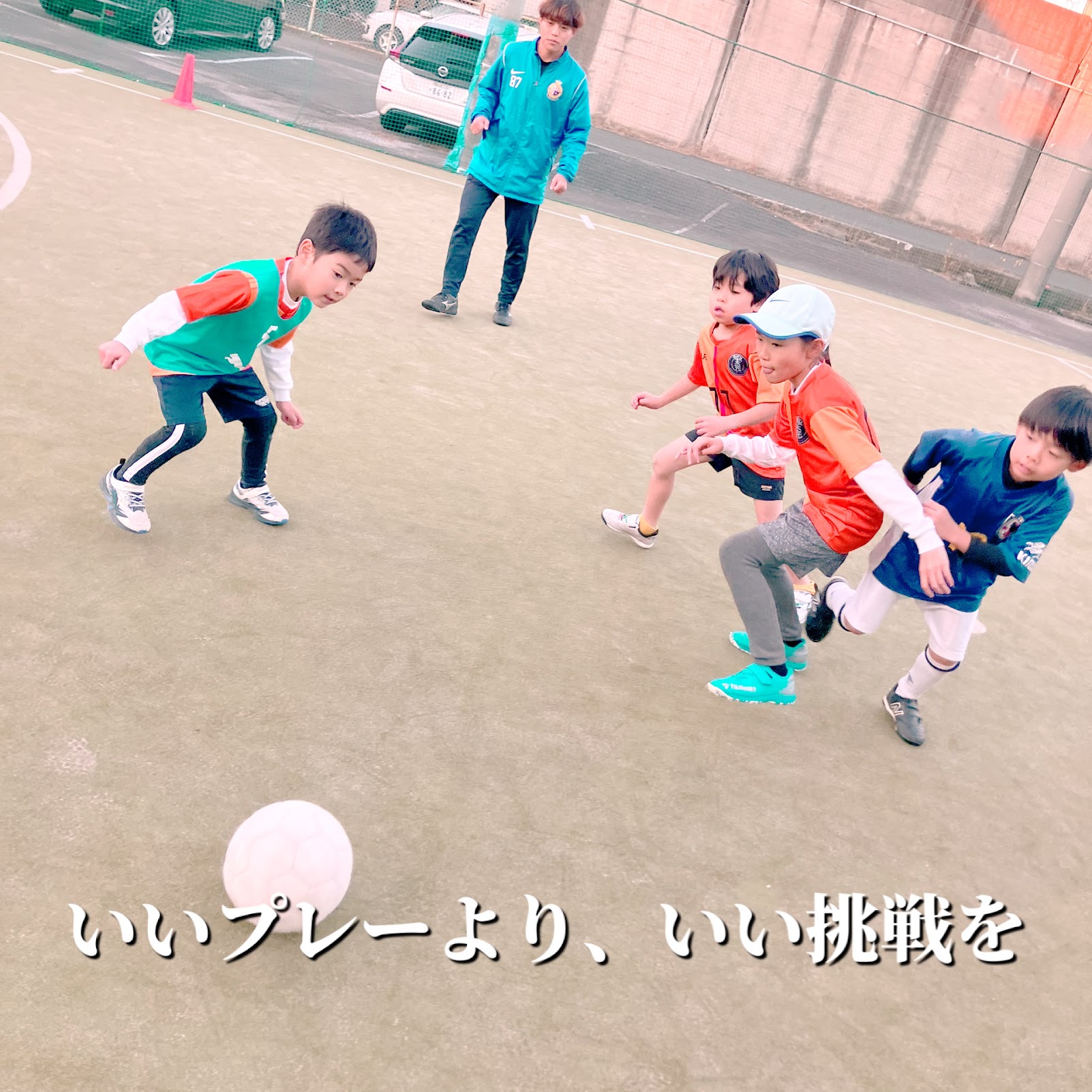 相手もいずれ付けたいが、まずは自分とボールの関係の中で扱いを楽しめるようになること。